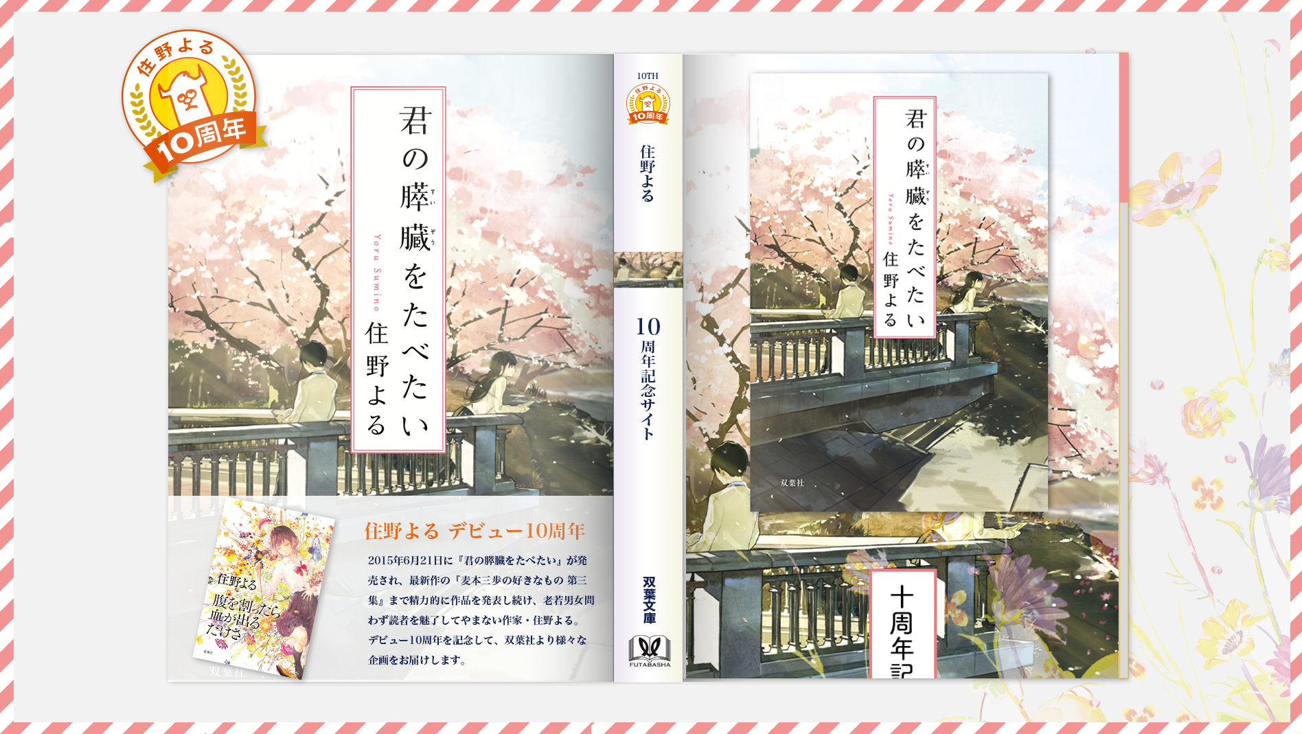 先日、住野よる先生から発表された、新刊文庫『腹を割ったら血が出るだけさ』の発売に加え、『君の膵臓をたべたい』×片岡健太(sumika)、『また、同じ夢を見ていた』×ヨシタケシンスケ、『よるのばけもの』×堀越耕平の期間限定カバーが非常に話題となっている、10周年記念施策がいよいよ8月6日より本格スタートします。