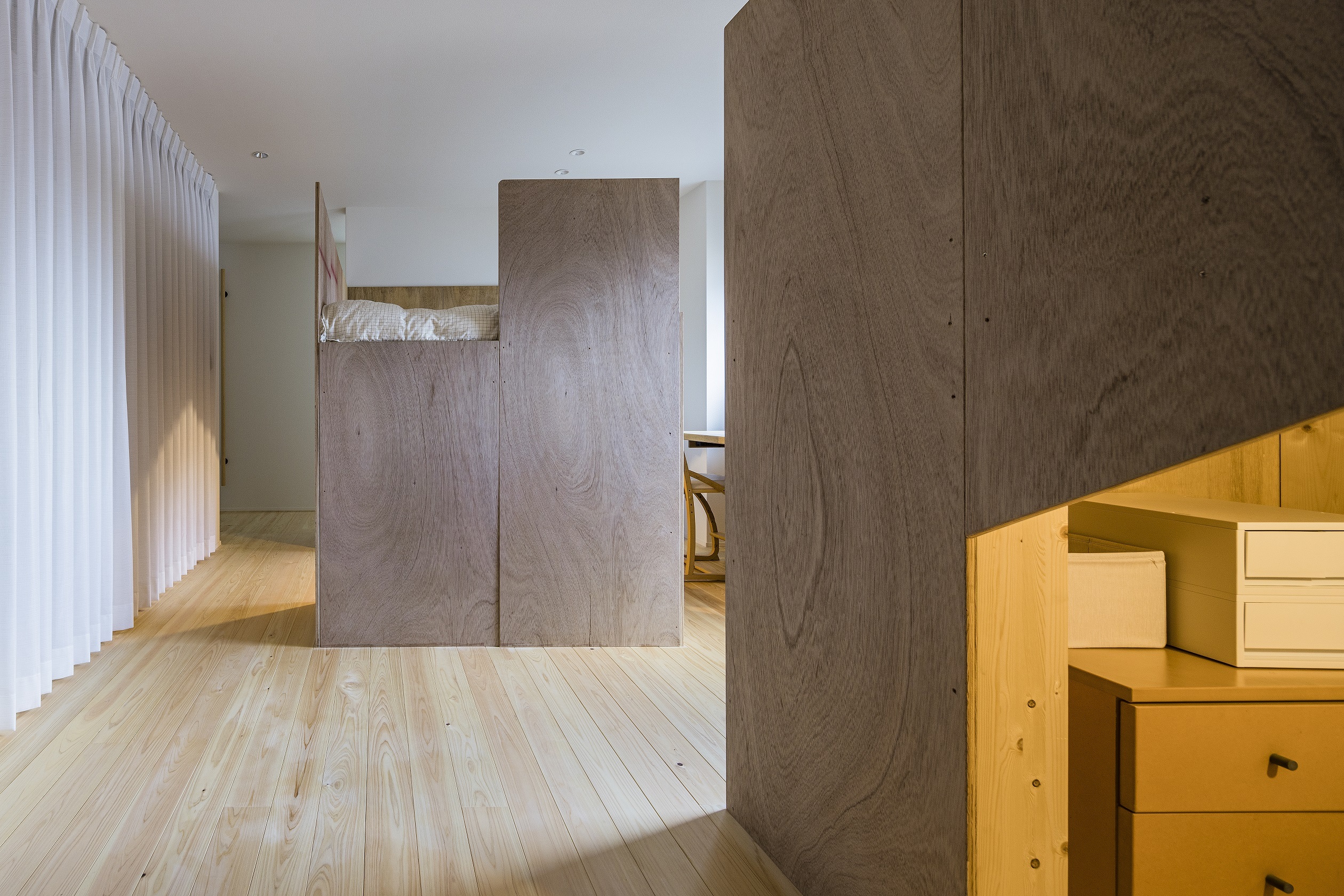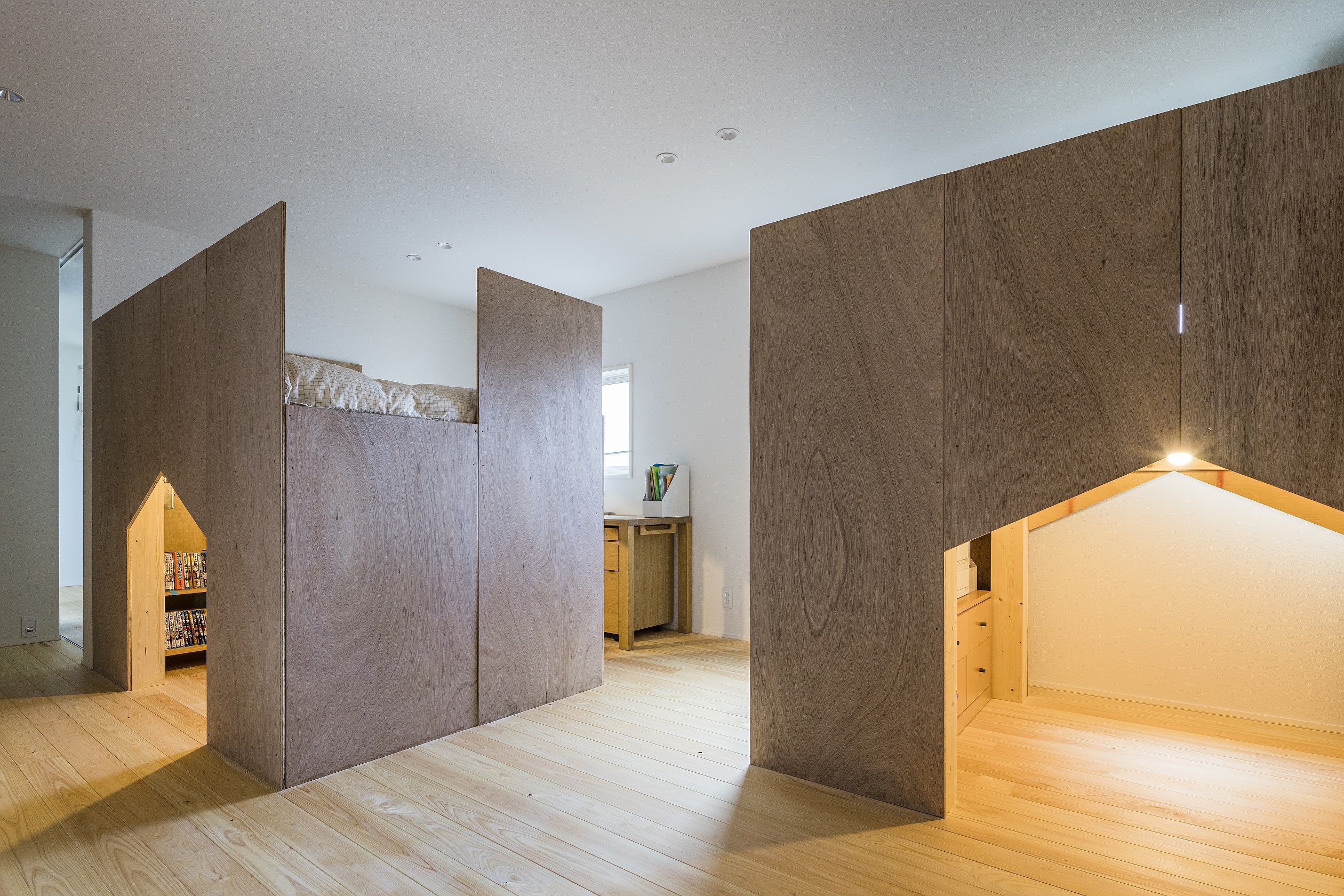 コア以外の空間はあえて用途の曖昧な余白とし、時間やシチュエーションに応じて多様な空間へと変化します。今は学習机が置いてあり、コアのおかげで適度なこもり感があります。コアを設ける場所によって余白の形状も変わり、より多様な空間が構成できます。