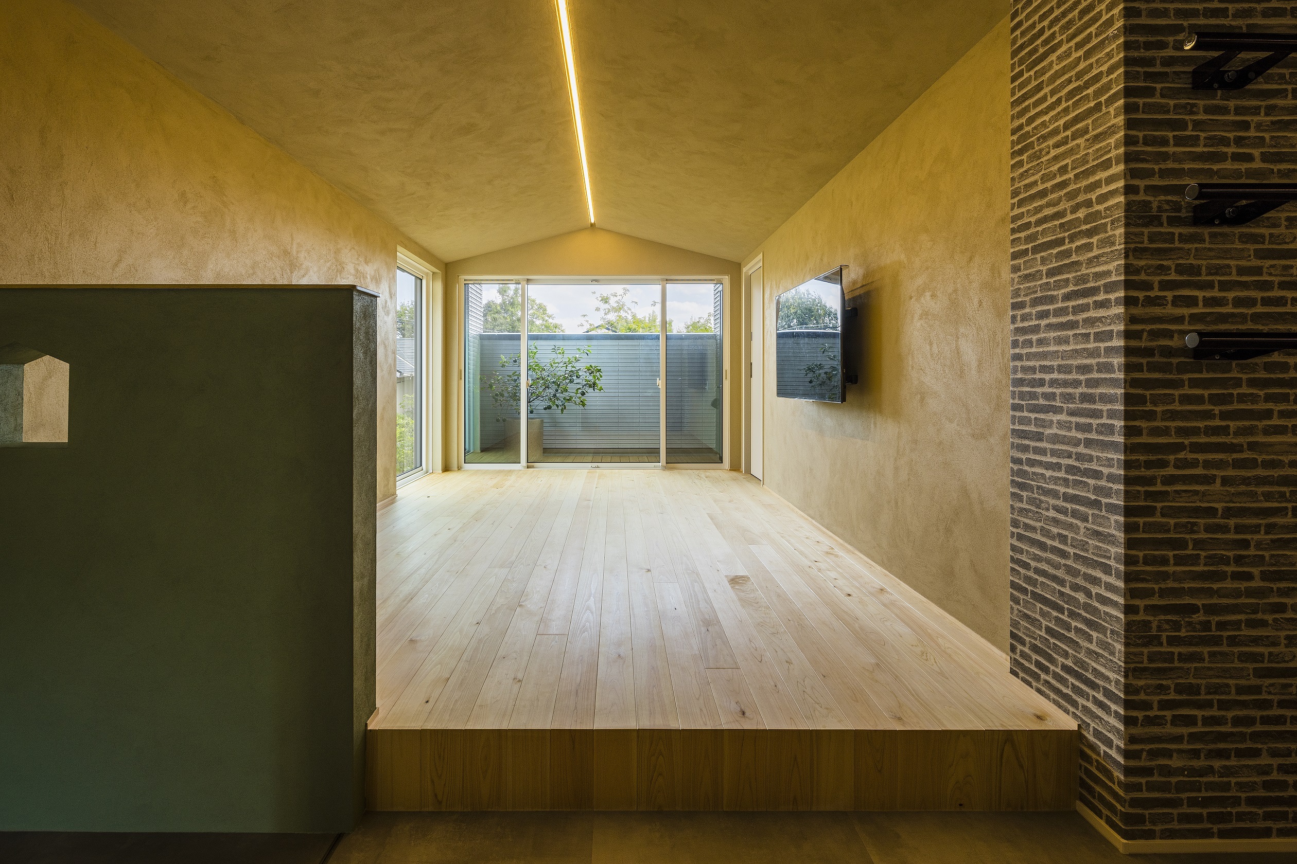 小上がりの床は無垢のヒノキ材を採用。天井のセンターにはライン照明を仕込んでいる