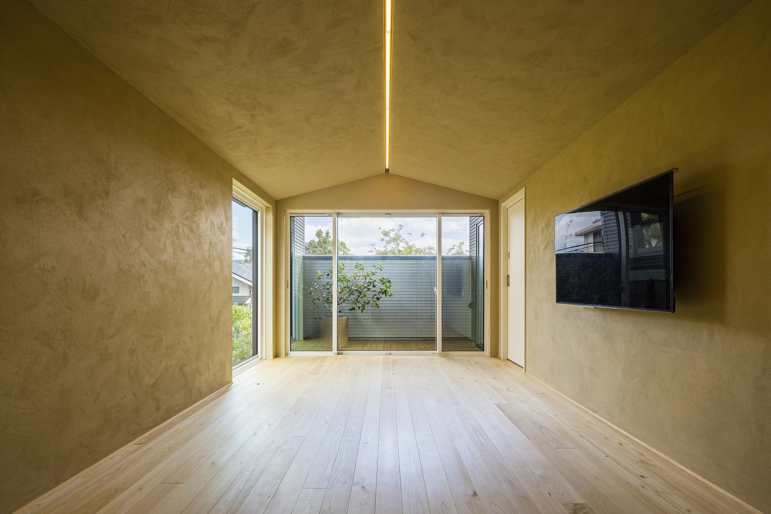 リビングの先には、奥行きのあるバルコニーが広がります。腰壁に囲われているため、外からの視線を遮り落ち着ける“おこもりどころ”になっています。開口部を設け緑の眺めを取り込むことで、閉塞感はなくくつろげます。