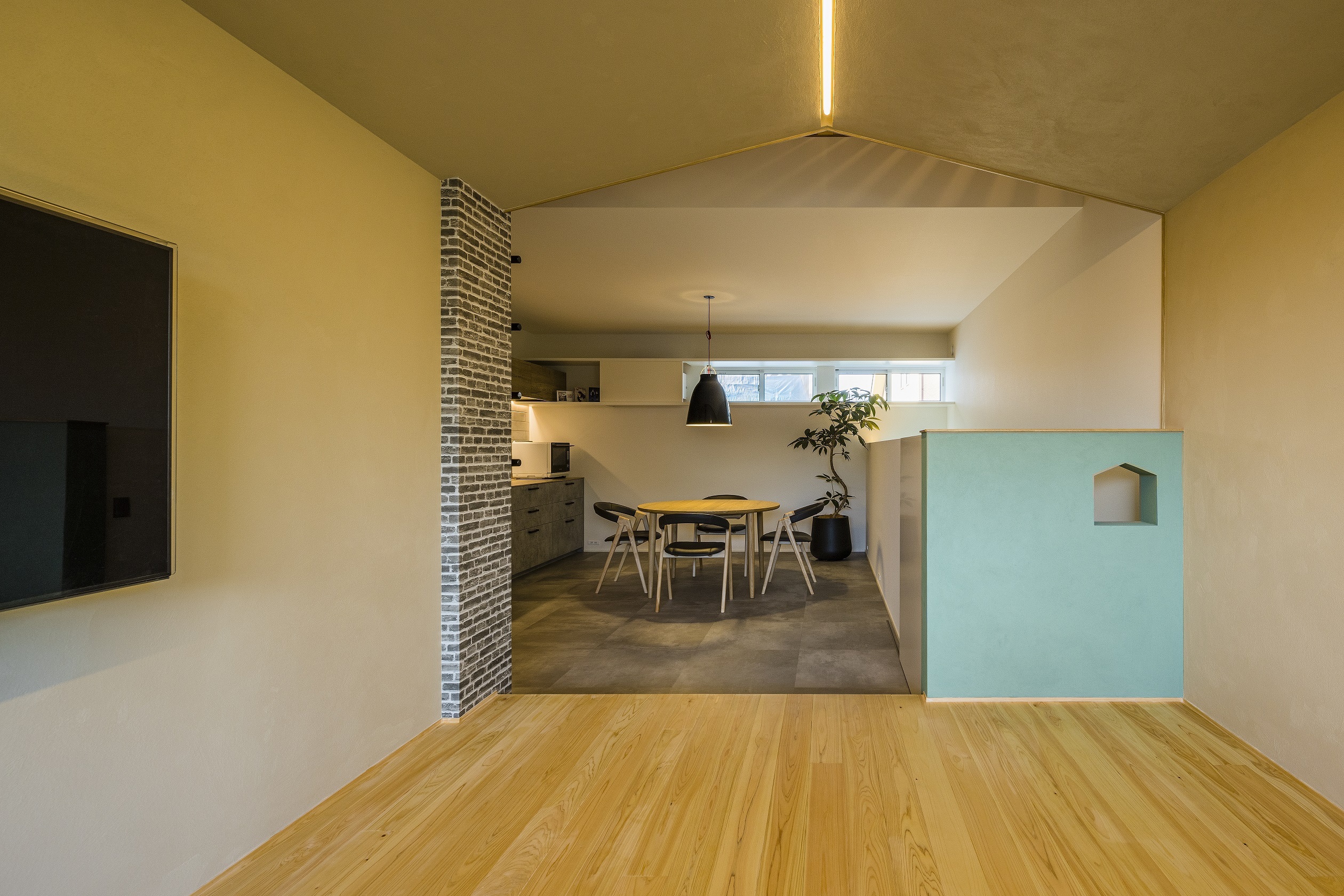 2階にはリビングを設けました。階段を上がると目の前に“門塀”をイメージした腰壁があり、その先にリビングが広がります。腰壁のブルーグリーン色は次男・Tくんが選び、ご家族みんなで「ポーターズペイント」を使い塗りました。住まいのアクセントカラーとして、また住まいづくりの大切な思い出にもなっています。後に、腰壁の家型のくり抜きの下に、アルファベットで表記した苗字を貼りました。表札のイメージです。