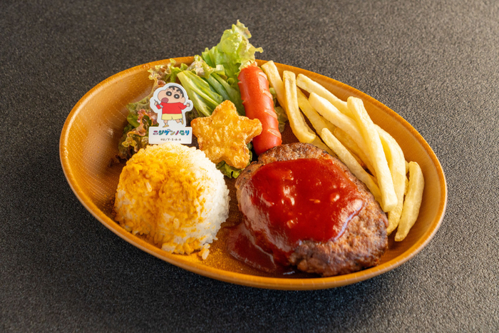 この度、お子様向けのコラボメニュー「オラのぷりぷりお子様プレート」を12月20日(土)より販売開始いたします。ケチャップがたっぷりかかったハンバーグやソーセージ、しんちゃんが大好きなチョコビをイメージした星形ポテトなどボリューム満点のお子様プレートが登場!しんちゃんのぷりっとしたおしりを表現したごはんの上にはスプーンを持った可愛らしいしんちゃんのピックが付いています。