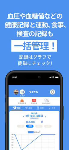 血圧や血糖値などの記録はもちろん、血液検査や尿検査の結果、食事や運動の記録も行えます。