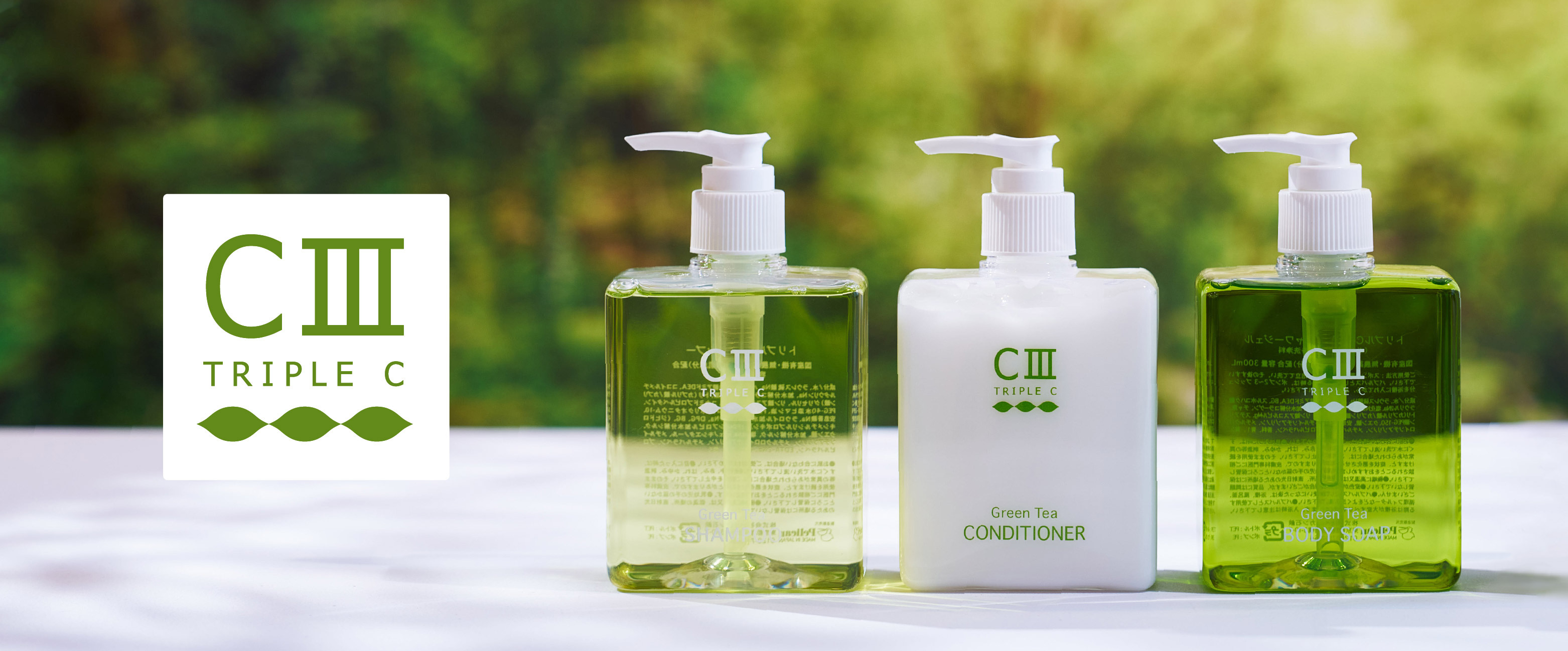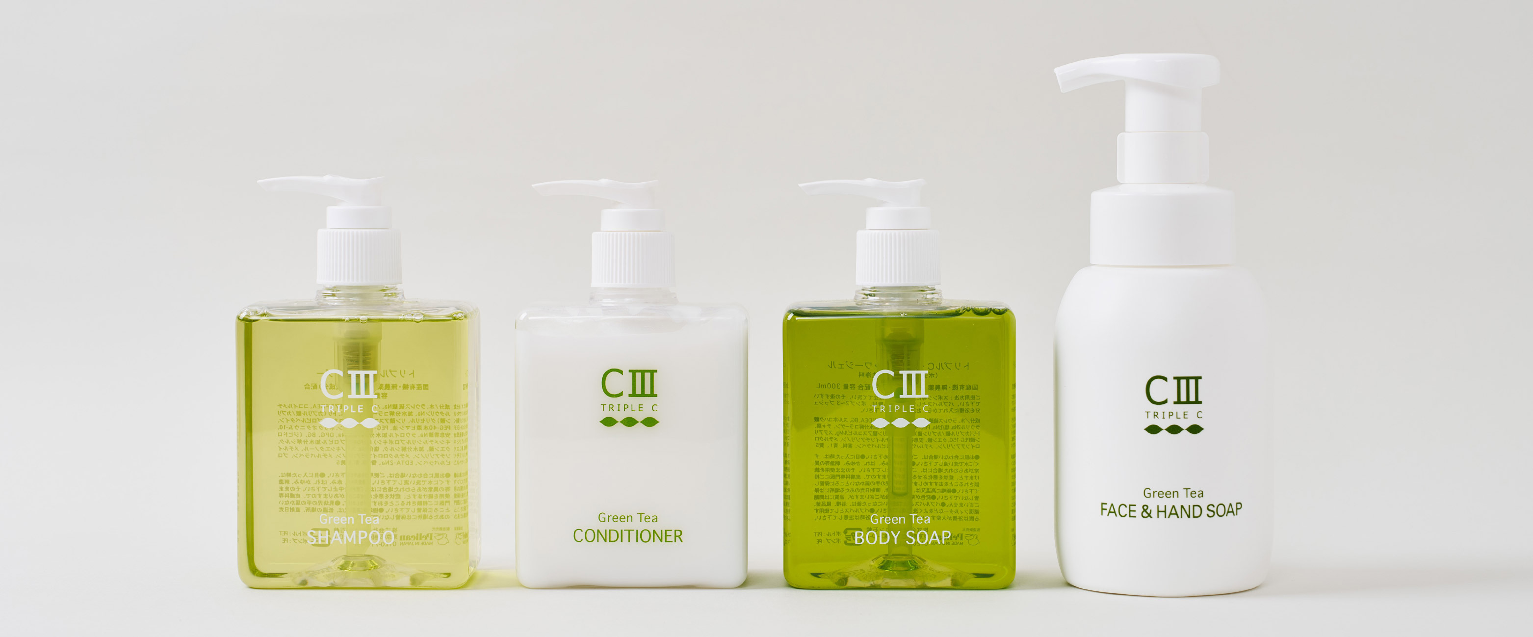 『トリプルC(トリプルシー/TRIPLE C)』のテーマは「緑茶」。国内外のお客さまに、「日本のホテルステイでの思い出に残るひとときをお過ごしいただきたい」。そんな想いで誕生したアメニティブランドです。ブランド名の『トリプルC』は、Catechin(カテキン)、Collagen(コラーゲン)、Vitamin C(ビタミンC)の「3つのC」から名づけられました。自然の緑茶葉をイメージし、クリアグリーンで統一されたパッケージデザインで、清潔感のあるバスルームを演出します。
