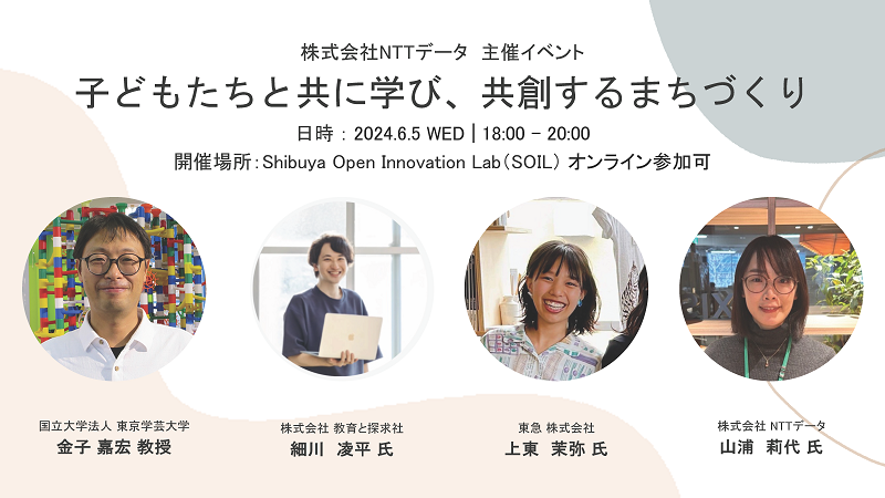株式会社教育と探求社は、2024年6月5日(水)に開催される株式会社NTTデータ様主催の「子どもたちと共に学び、共創するまちづくり」セミナーに、当社の細川凌平が登壇することをお知らせいたします。本セミナーはオフラインとオンラインのハイブリッド形式で行われます。参加は無料で事前申込が必要です。詳しくは以下のリンクからお申し込みください。