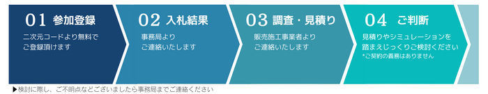 本事業への参加事業者は、販売施工事業者や製品を選定する手間を省きつつ、概算の設置費用や投資回収年数シミュレーションなど、検討に必要な資料を入手し、具体的な導入の検討をすすめる事が出来ます。販売施工事業者は、特定のエリア内で多くの受注を見込めるため、コストの合理化が図れ、販売施工価格を下げることが可能となります。自治体は、事業者のみなさまへの機会提供や地域の再生可能エネルギーの普及が叶います。