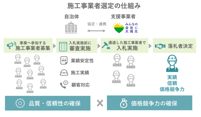 共同購入では、”品質”と”価格競争力” を担保するために販売施工事業者の事前審査と入札を実施しています。優良かつ価格競争力のある販売施工事業者のみが本事業に参加できるようにするため、事前審査では、販売施工事業者は施工実績や施工・メンテナンス体制、財務状況などの観点で厳しくチェックをされます。入札では、事前審査に通過した販売施工事業者の中で、最も安い価格を提示した販売施工事業者が選ばれます。
