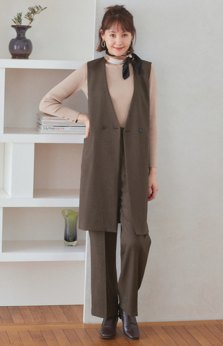 ロング丈ジレとワイドパンツのセットアップ。ロング丈ジレは、気になる体型カバーにも使える着回し力の高いアイテムです。