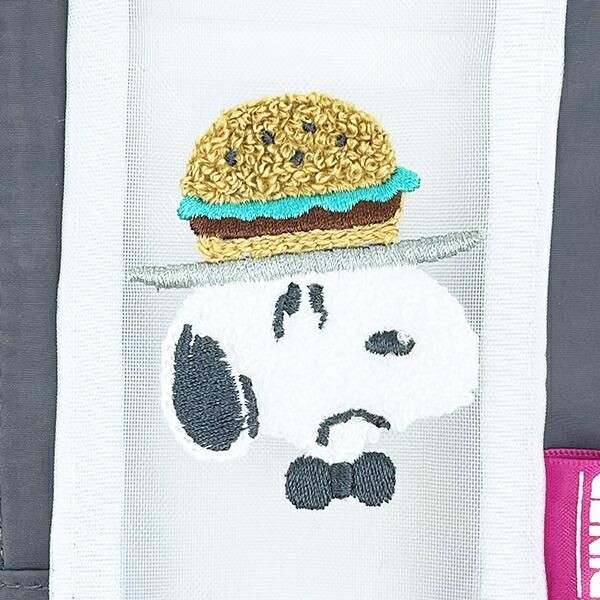 お色、デザイン違いもございます。今度はスヌーピーの頭の上においしそうなハンバーガーが乗っかっています。こちらは先ほどのパフェのデザインと対照的にグレーで比較的落ち着いた印象です。