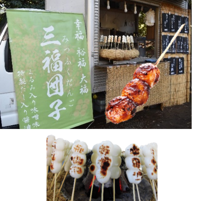 ●内 容:「三福団子」は、大福・幸福・裕福の三つの福が一体になった縁起の良いおだんごといわれています。炭火でじっくり焼き上げオリジナルのくるみ味噌だれや特製の醤油だれをつけたおだんごや温かい甘酒を提供します。