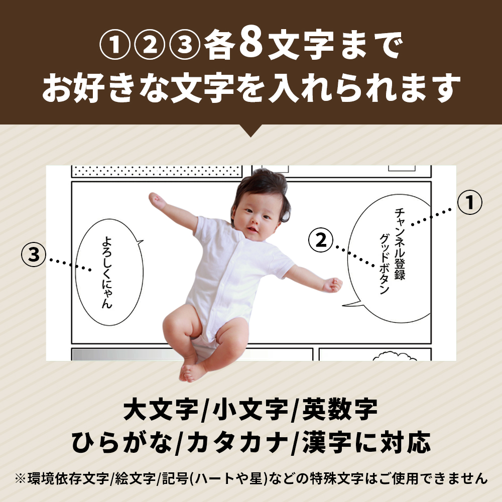 漫画のフレームデザインのバスタオルにお好きな文字を入れることができ、バスタオルの上に転がればまるで漫画の主人公になったかのように感じられる商品です。赤ちゃんだけでなく、大人の方でも楽しめるユニークなバスタオルです。