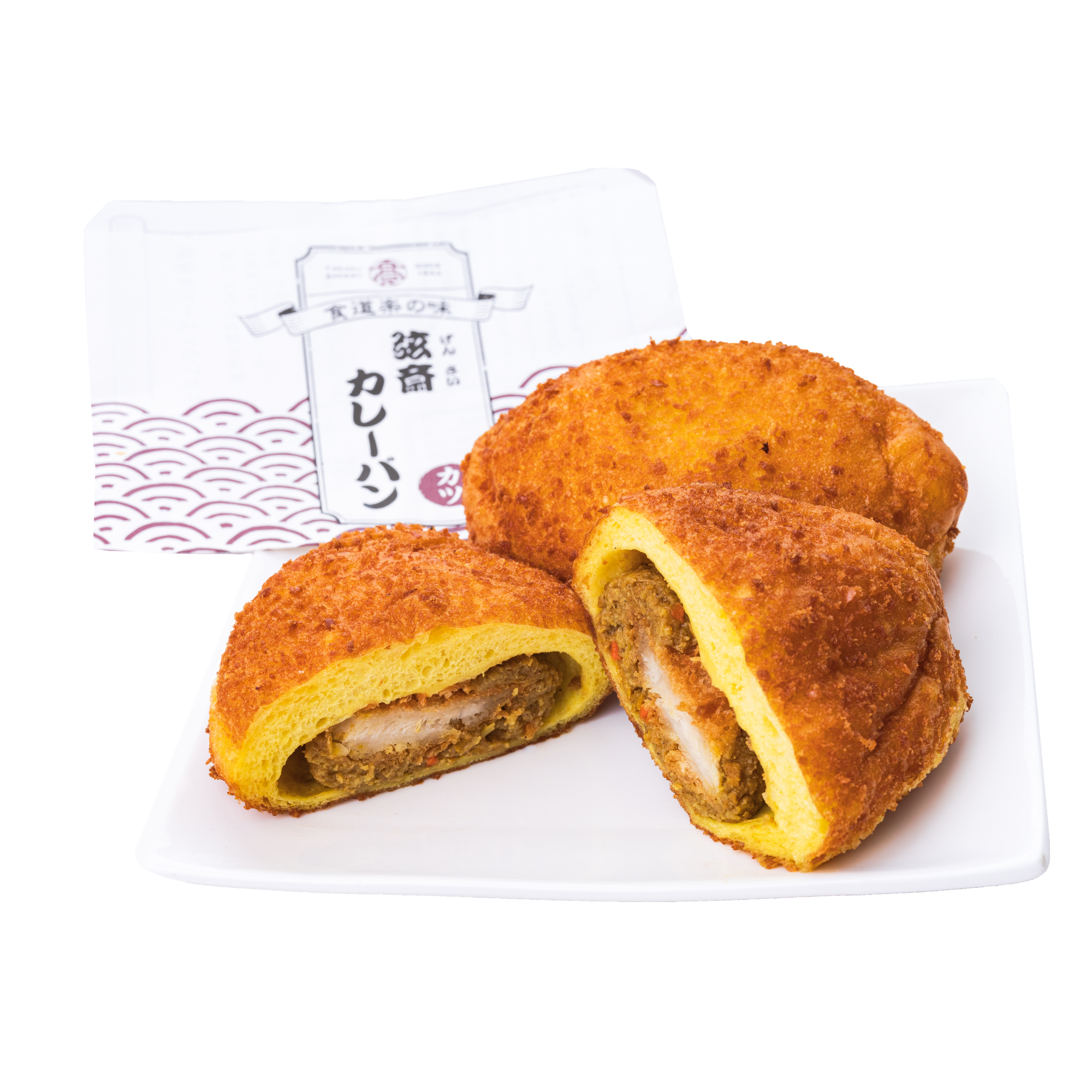 元祖・弦斎カレーパン。ご飯を練り込んだもちもち生地に、ターメリックを加えることでカレーの風味をほんのり感じられる仕上がりです。中には24種類のスパイスを使用した本格カレーと、カレーライスを再現する福神漬けを忍ばせました。カレーライスをそのまま包んだ満足感のある一品です。