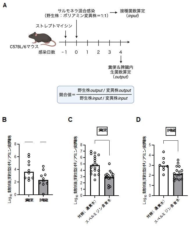 ●外界からの取り込みによるサルモネラのポリアミン恒常性は、マウスに対する病原性発現に重要である。