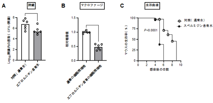 宿主内ポリアミンレベルとサルモネラ感染性の関係を明らかにするために、宿主ポリアミン合成の律速酵素であるオルニチン脱炭酸酵素の阻害薬エフロルニチンを、マウス飲水に加えました。エフロルニチン飲水マウスにおけるネズミチフス菌の脾臓内生菌数は、通常水を飲水した対照マウスと比較して、有意に減少していました(図4)。さらに、細胞培養液にエフロルニチンを加えると、マクロファージ様細胞に感染したネズミチフス菌の細胞内増殖能が減少しました(図4)。一方、スペルミジン含有水を飲水したマウスでは、ネズミチフス菌の感染能が上昇しました(図4)。さらに、ネズミチフス菌が感染したマウスのポリアミン量を測定した結果、感染していないマウスと比較して、糞便中および脾臓内のポリアミン量は明らかに上昇しました。これは、ネズミチフス菌感染により、アルギニンからオルニチン産生を促すアルギナーゼ活性の上昇が一因でした。これらの結果は、宿主のポリアミンレベルとサルモネラ感染の関係性を明らかにしたものであり、驚くべきことに、サルモネラは戦略的に感染宿主のポリアミンレベルを上昇させ、感染に有利となる状況を作り出している可能性を示唆するものです。また、宿主のポリアミン量を抑制することは感染制御につながることを示唆しています。