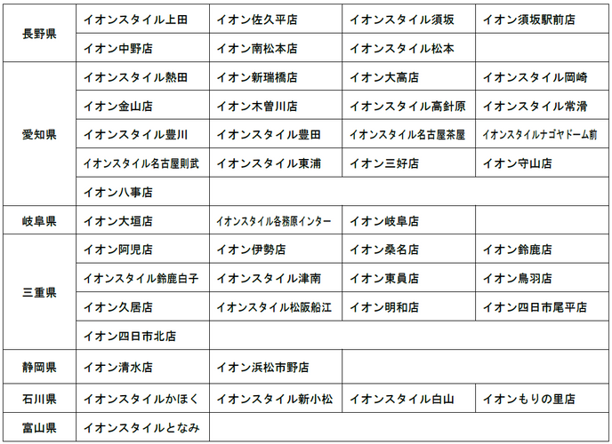 販売店舗:長野・愛知・岐阜・三重・静岡・石川・富山県内の「イオン」「イオンスタイル」47店舗
