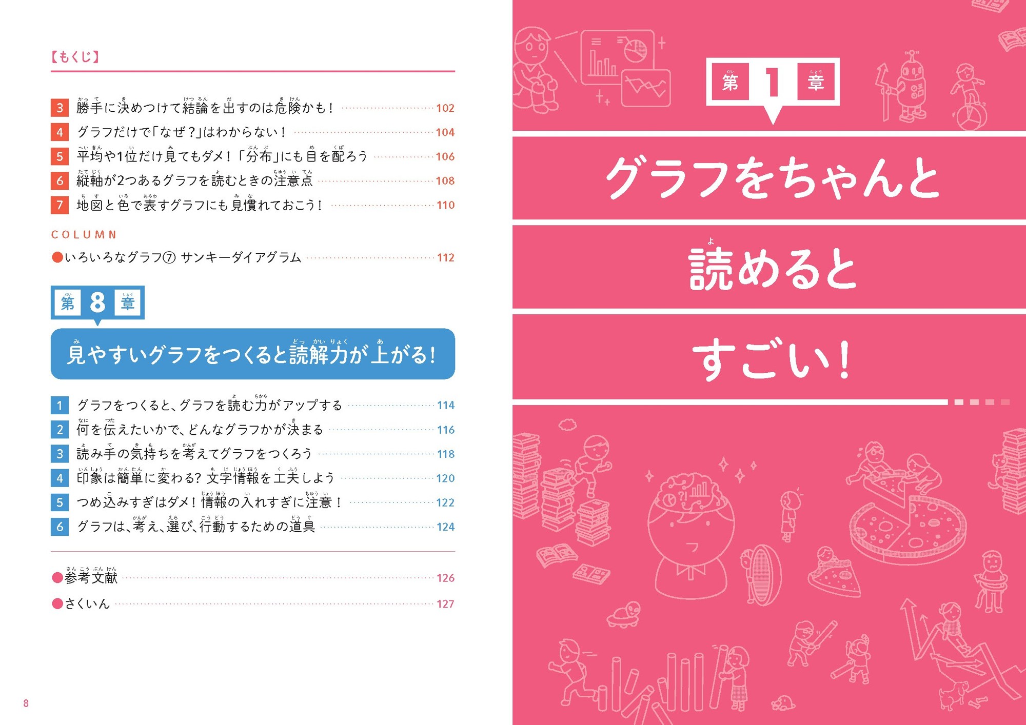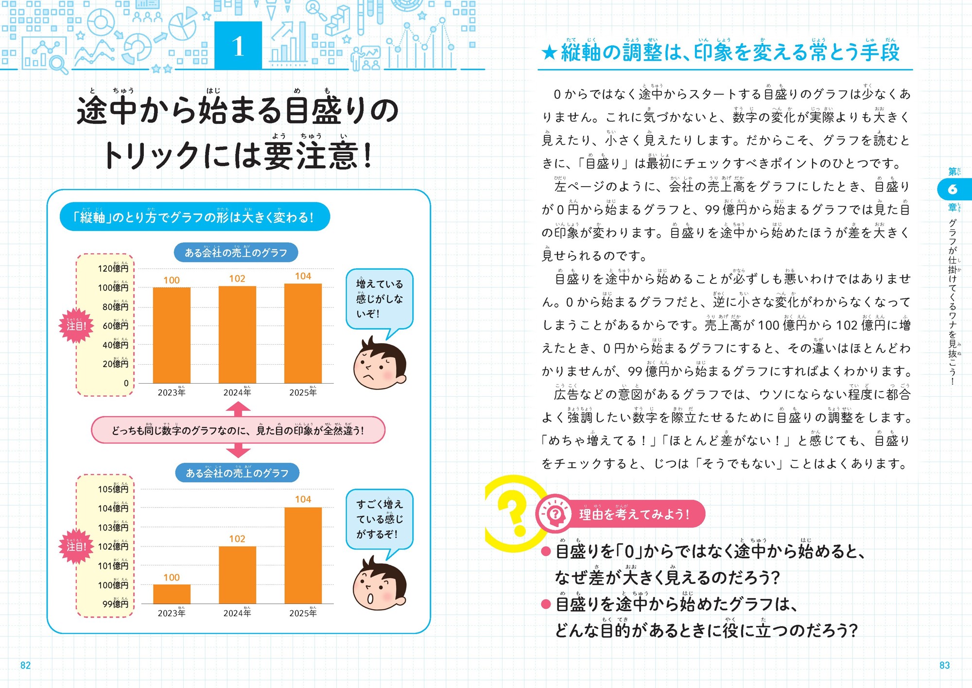 この本では、グラフの種類や読み方のコツを学びながら、「何を比べているのか」「基準はそろっているか」「本当にそう言えるのか」といった、考える視点を身につけていきます。