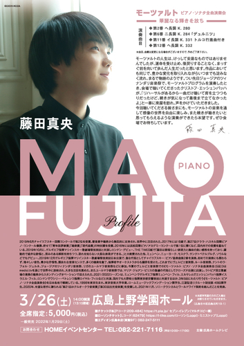 広島ホームテレビ(所在地:広島県広島市、代表取締役社長:三吉 吉三)は、主催で2022年3月26日(土)「藤田真央 モーツァルト・ピアノ・ソナタ全曲演奏会~華麗なる輝きを放ち~」を広島上野学園ホールで開催いたします。