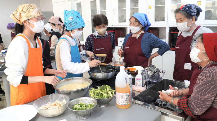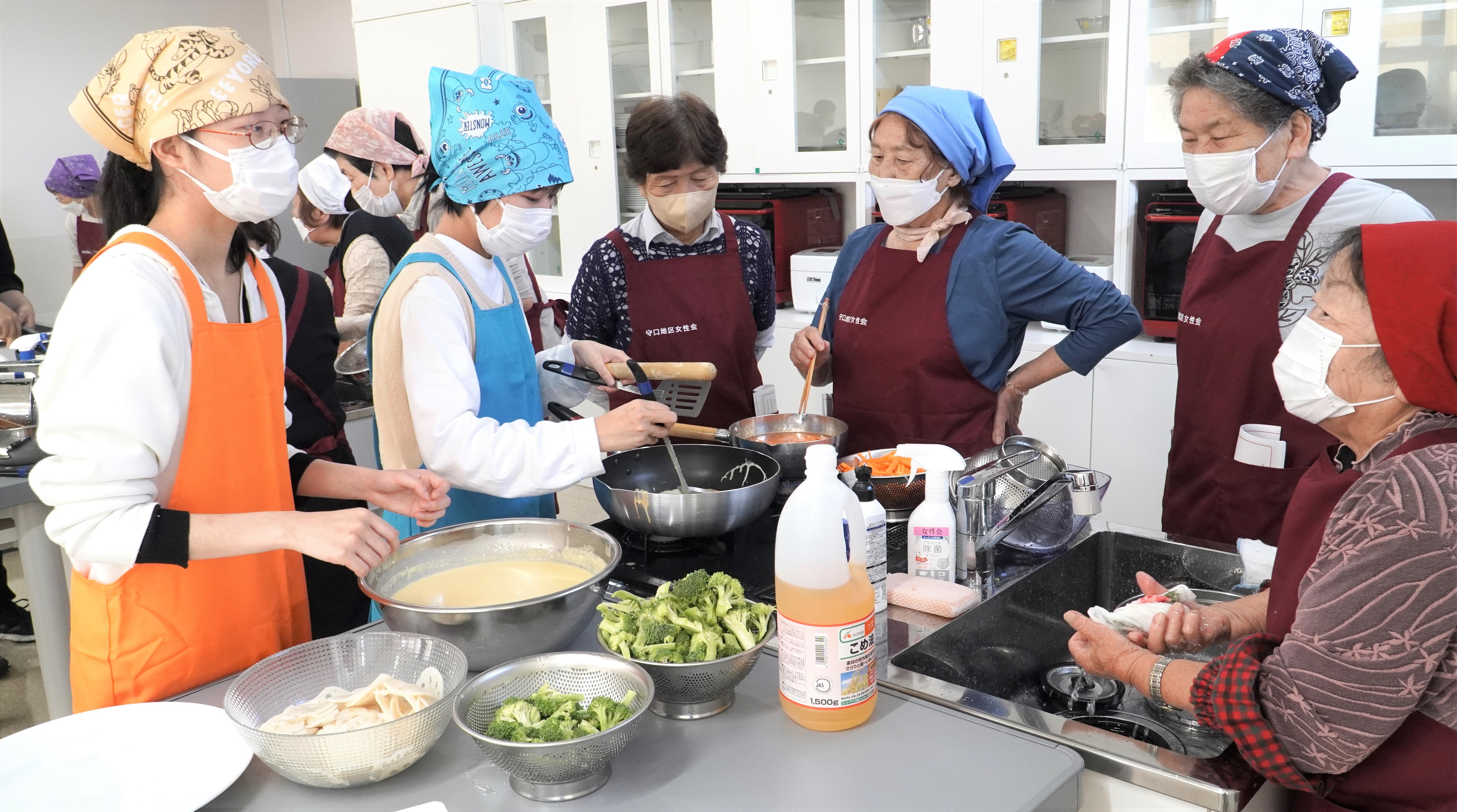 参加した学生からは、「自分たちの考案したメニューを外部の方々に披露できることに達成感を感じた」、「”おいしい”と言っていただき、やりがいを感じた」、「作業の段取りの大切さを痛感した」、「的確に指示を出すことの難しさを感じた」、「料理の楽しさやコツを教えていただいた」、「栄養士として就職した際にこの経験をいかしたい」など、様々な感想が寄せられました。普段とは違う環境と限られた時間内での料理教室は学生にとって貴重な経験となり、「実践的な学び」となりました。
