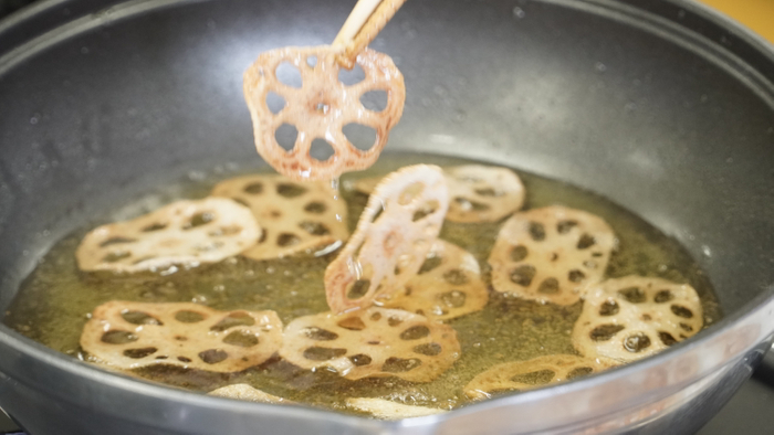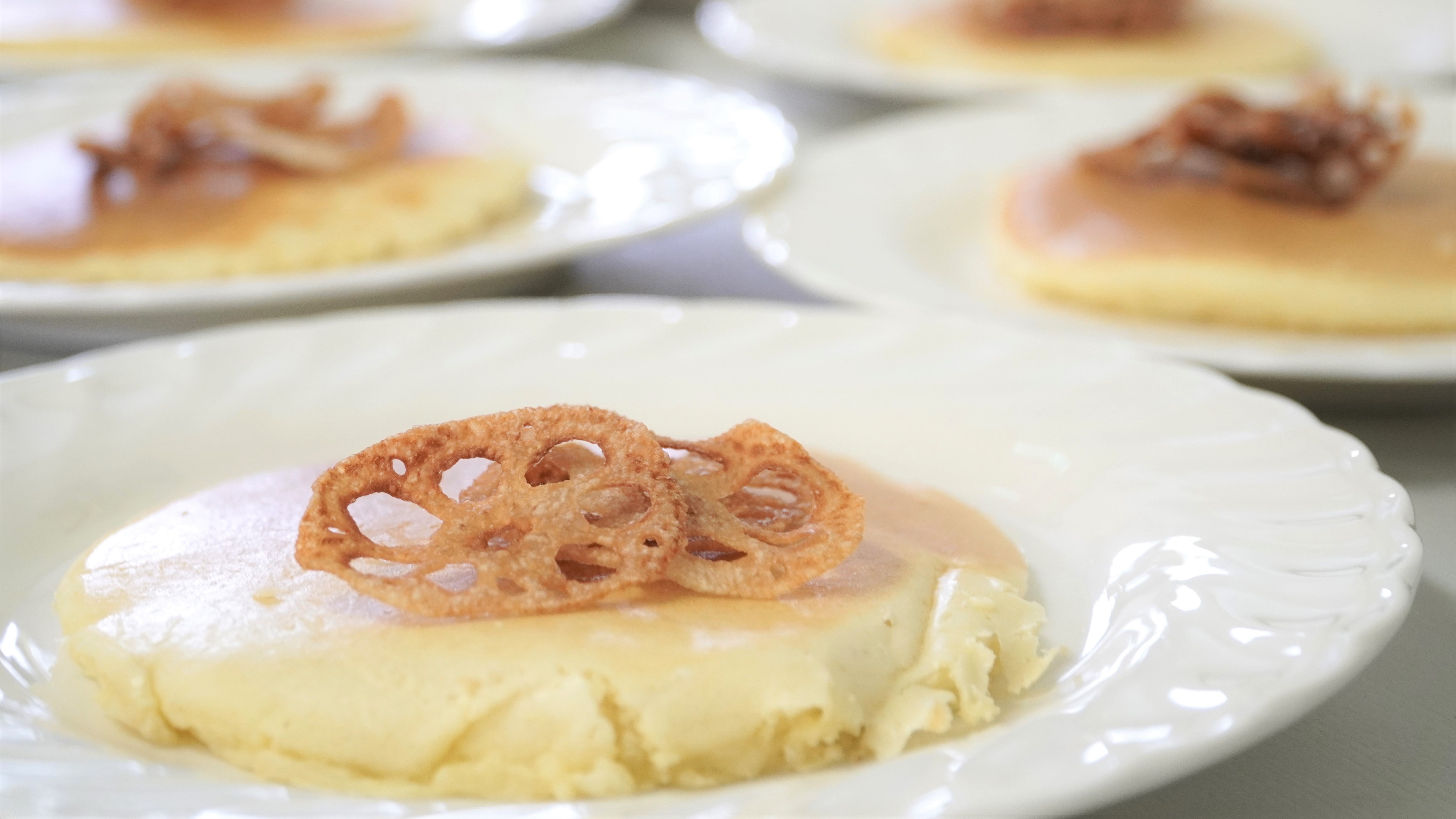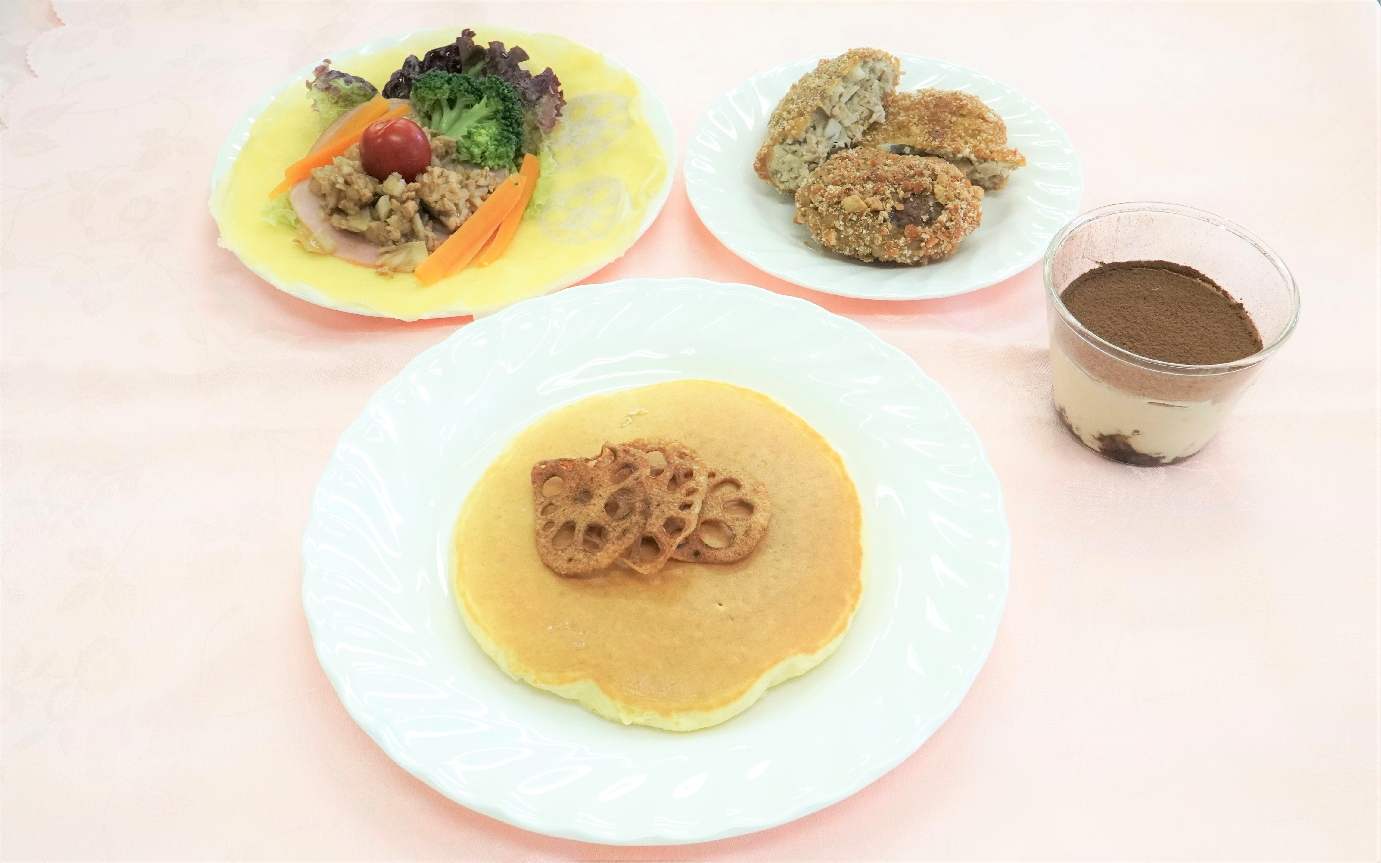 ティラミスではコーヒー味のスポンジ部分にれんこんを、パンケーキでは米粉を使用した生地にすりおろしたれんこんを使用し、コロッケでは具にれんこんを、クレープでは生地にれんこんの輪切りを散らすなど、レンコンの栄養成分以外にも食感や見た目も考慮したものになりました。