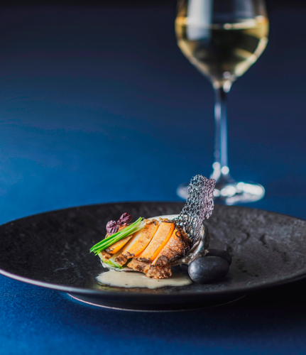 サイフォン仕立ての鴨コンソメをそそぐ「フォアグラと烏骨鶏卵のロワイヤル」には、柑橘系の華やかな果実風味が特徴的な「パスカル エ ローラン ボルジョ シャサーニュ モンラッシェ V.V」など、ペアリングはワイン6種、ノンアルコールドリンク3種をご用意。