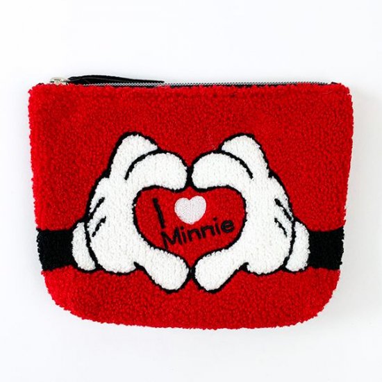 こちらのキュートなポーチはディズニーデザインです。ミッキーのおててがハートを模った人気のデザイン♪真ん中には「アイラブミニー」の文字が入っています。赤と白のカラーパターンも素敵ですよね~!