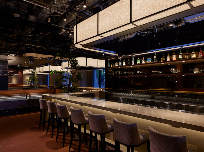 エントランスに面する大きなアイランド型バーカウンターには古き良き時代の日本を思わせる手漉き和紙の行灯が吊るされ、その裏面には最先端技術を駆使した映像システムを楽しめる何台ものディスプレーが張り巡らされております。
