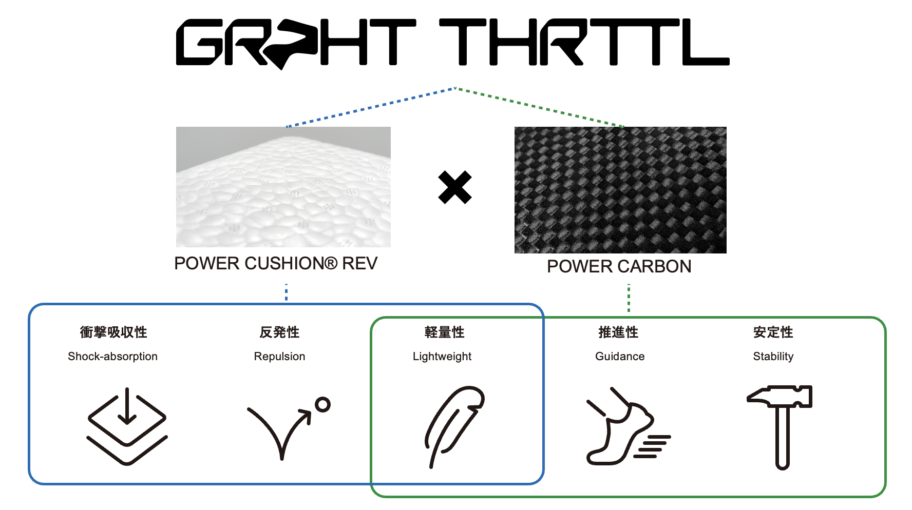 本製品は、ヨネックスの最新素材「POWER CUSHION® REV」と「POWER CARBON」を融合させた新構造「GRPHT THRTTL」を搭載した次世代モデルです。「POWER CUSHION® REV」による高いレベルのクッション性に加え、「POWER CARBON」が高い復元力と反発力を生み、次の一歩への推進力が向上します。