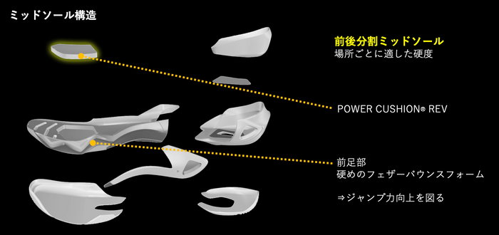 ミッドソールには「POWER CUSHION® REV」と「フェザーバウンスフォーム」を使用。前後で硬さを分割した新構造にすることで、前足部は反発力を強化しつつ、後部には衝撃吸収性を高めました。