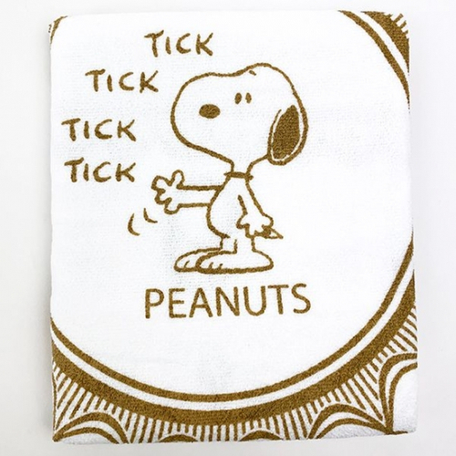 続いては、時計がモチーフの湯上りタオルです。時計の針のようなアクションのスヌーピーがセンターに描かれていますね♪