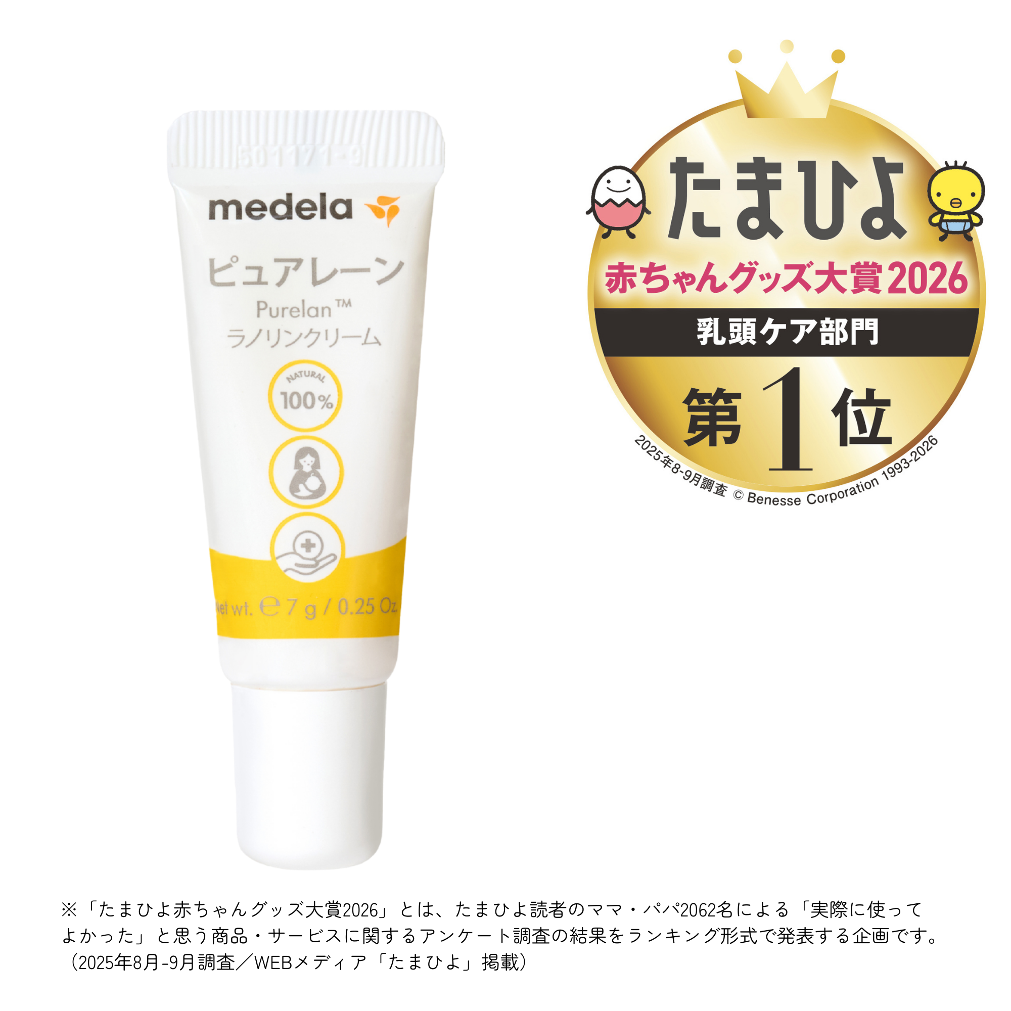 メデラ株式会社(本社:東京都渋谷区、代表取締役社長:馬場 淳一、以下 メデラ)の乳頭ケアクリーム「ピュアレーン」が、株式会社ベネッセコーポレーションが運営する妊娠・出産・育児ブランド「たまひよ」が2026年1月15日に発表した「たまひよ 赤ちゃんグッズ大賞2026」において、2018年から8年連続で乳頭ケア部門第1位を受賞いたしました。