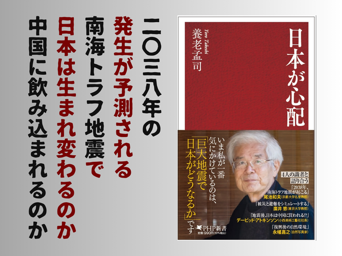 株式会社PHP研究所(京都市南区・代表取締役社長 瀬津要)は、養老孟司さんの新刊『日本が心配』を2025年2月18日に発売します。2024年8月に続き、2025年1月13日にも「南海トラフ地震臨時情報」が発表されるなど、巨大地震への警戒が高まっています。本書は、養老さんがいま一番危惧している南海トラフ地震について、地震、防災、経済、環境を専門とする4人の識者と語り合った対談集です。災害発生時だけでなく、その後に予測される日本社会の変化を詳らかにし、今こそ日本人が真剣に考える時がきてると警鐘を鳴らしています。