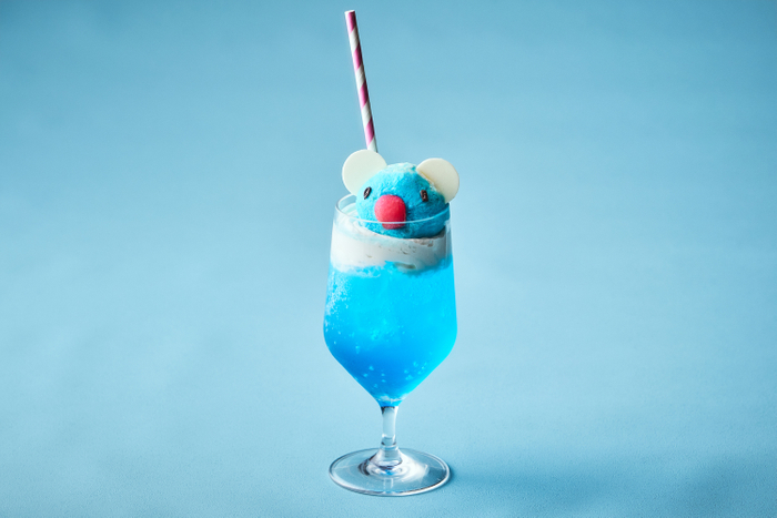 クリームソーダからペネロペの顔がのぞくかわいらしい一品。見た目も味わいも涼しげで爽やかなドリンク。ペネロペの大きなお鼻がグラスに乗っているのがポイント。