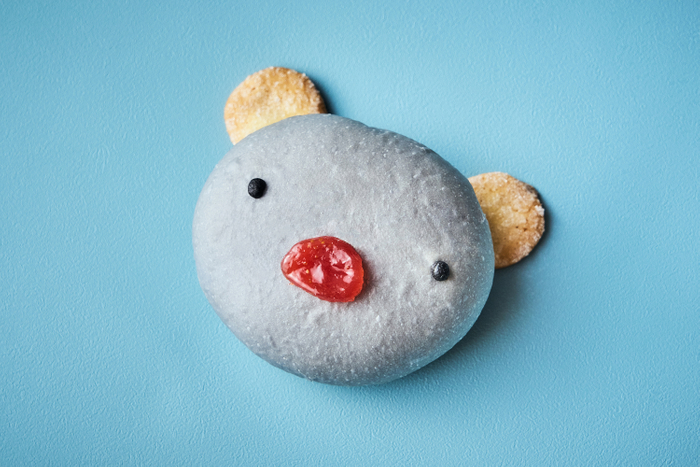 ペネロペの特徴である耳はクッキー生地で、大きな赤いお鼻をドライストロベリーで表現。パンの中のクリームはミルクチョコレートにオレンジピールとナッツ、クリームチーズをあわせ、食感も楽しい一品。