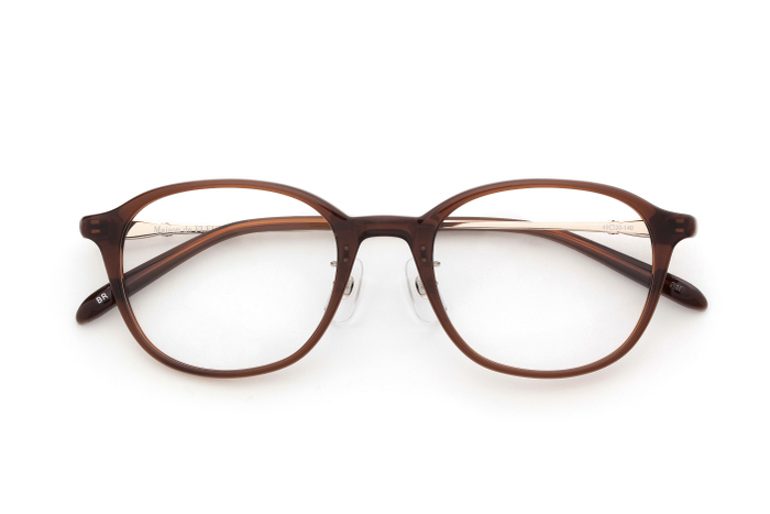 レンズ枠がプラスチック、テンプルがメタルのコンビネーションフレーム。レンズシェイプはボストン型とウェリントン型の間のボスリントン型。MDF-006と共通の、線彫りが特徴のテンプルデザインです。