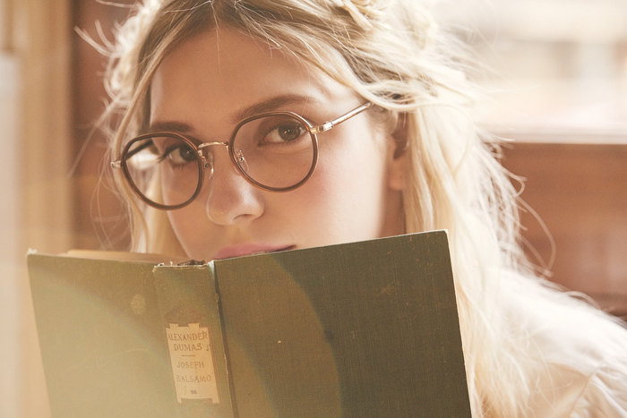 レンズの上下幅が浅めのベーシックなデザイン。プラスチックのテンプル仕様で、丁番部分にはスズランのモチーフを丸いメタル飾りに施しました。