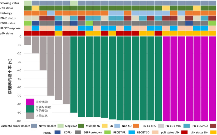 その結果、がんの面積が10分の1以下に縮小した患者の割合は63%でした。また、外科切除で完全切除できた患者に限ると、その割合は76%となり、非常に良好な成績を示しました。今後、この新規治療法が局所進行肺がんの標準治療となることが期待されます。