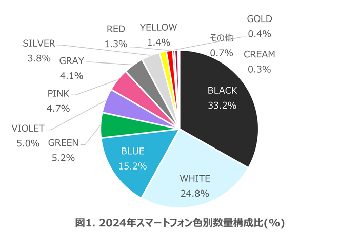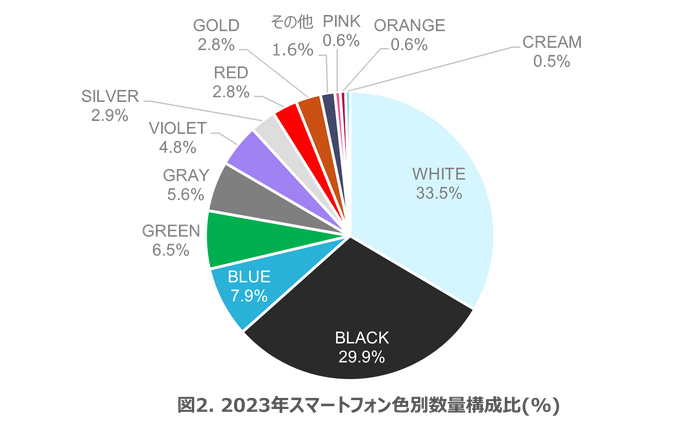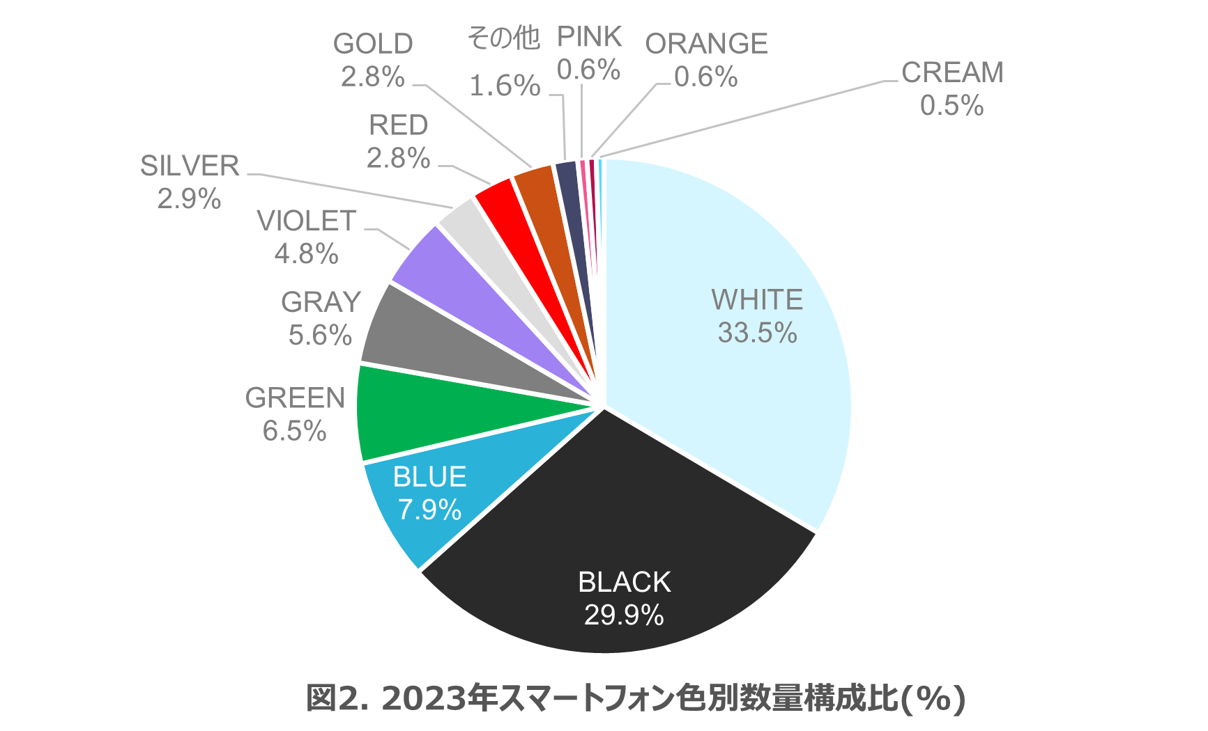 これまでも黒や白などのニュートラルな色が上位にのぼり、この2色でスマートフォンの約6割を占めていた(図1、図2)。