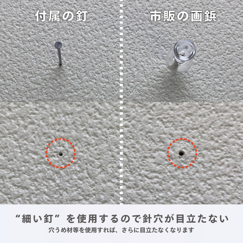 市販の画鋲より細い釘を使用し、壁面に対し斜めに釘を入れるので、取り外した際の針穴が目立ちません。また、複数本の釘を使用することで強度も確保しました。