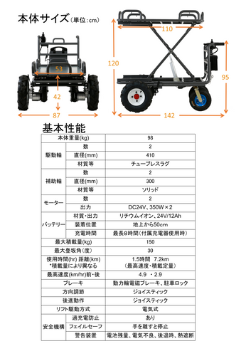 使用時間:1.5時間・7.2km(積載定量の荷物を載せて最高速度で前進させた場合)