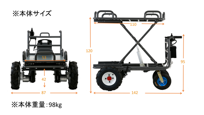 サイズ :長さ142cm×幅87cm×高さ95cm(リフト最大高120cm)、98kg