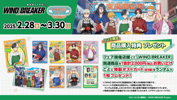 フェア展開店舗にて「WIND BREAKER」関連商品を1会計税込2,000円お買い上げごとに「ポストカード(全9種)」を1枚ランダムでプレゼントいたします。