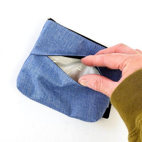 デニム風のブルーの帆布素材がかわいい、ラウンドポーチです。