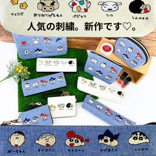 クレヨンしんちゃんちび刺繍シリーズに新柄♪デニム風カラーにキャラ勢揃いのポーチやペンケースたち