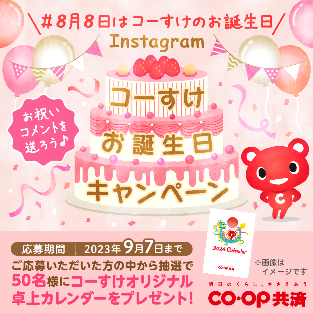 コープ共済連(日本コープ共済生活協同組合連合会、代表理事理事長:和田 寿昭)は、抽選で50名の方に非売品の2024年版コーすけオリジナル卓上カレンダーをプレゼントする「Instagramコーすけお誕生日キャンペーン」を2023年8月8日(火)~2023年9月7日(木)まで実施します。本キャンペーンは、CO・OP共済キャラクター コーすけのお誕生日(8月8日)を記念し開催いたします。ぜひどなたさまも、お祝いのコメントをお送りいただき、キャンペーンへ奮ってご応募いただけますと幸いです。