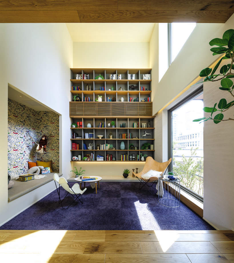 スキップラウンジは、立ち上がり高さが1.4メートル、広さが6.25平米。壁面には大きな本棚と、床に座って勉強したり本を読んだりするためのカウンターを造り付けています。2階の子ども部屋にも机がありますが、お子様たちは主にこのカウンターで宿題をしたり本を読んだりしていると言います。