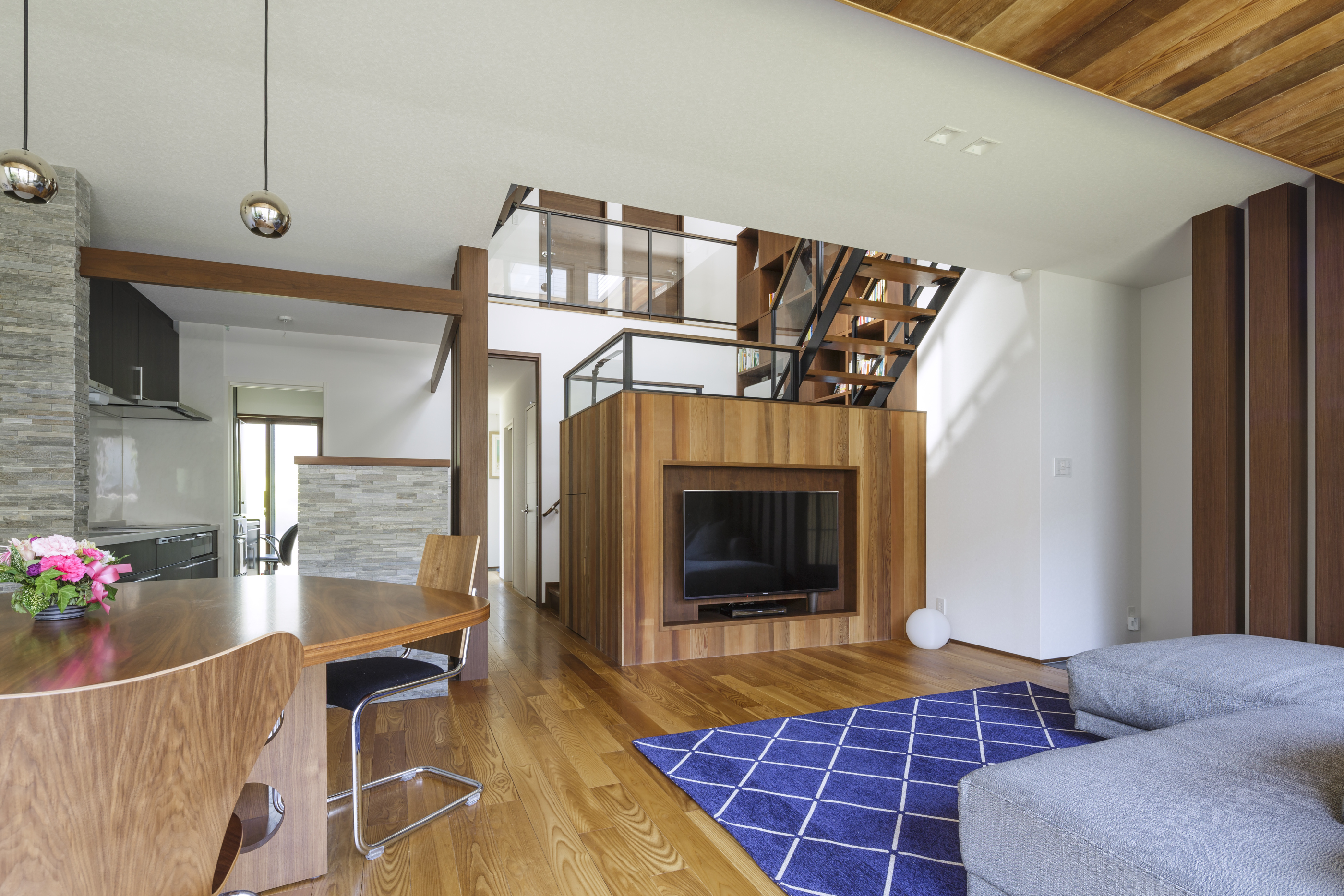 スキップラウンジがあるのはリビングの一角。ここを中継点とし開放的な吹き抜けがあり、垂直方向にも水平方向にも広がりのあるダイナミックな空間になっています。リビングの天井のアクセントやスキップラウンジの立ち上がりの壁には無垢のレッドシダー材を貼り、木のぬくもりを十分に味わえます。さらに、スキップラウンジの手すりやガラスの面材は、2階の手すりや階段と同じ素材と色を使用しているため、全体的に統一感があり、空間につながりも感じられます。