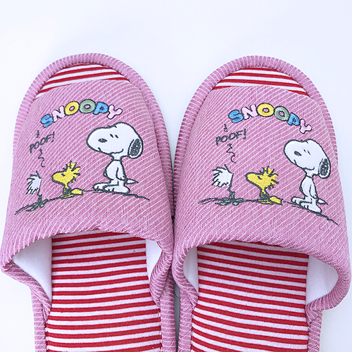 スヌーピーとウッドストックの、外縫いスリッパです。足入れ部分のボーダーがポップですね。カジュアルな雰囲気もあり、デイリー使いにピッタリです。