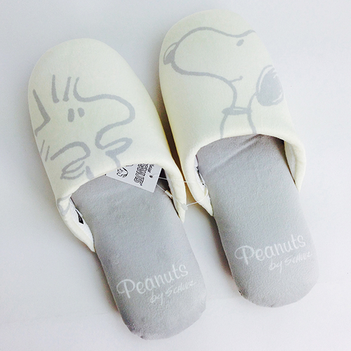 まずは、ソニークリエイティブプロダクツのスリッパをご紹介♪片方ずつにスヌーピーとウッドストックがデザインされています。ホワイト×ライトグレーの色合わせがオシャレですね。デイリー使いにも、お客様用にも使えてオススメの一品です。