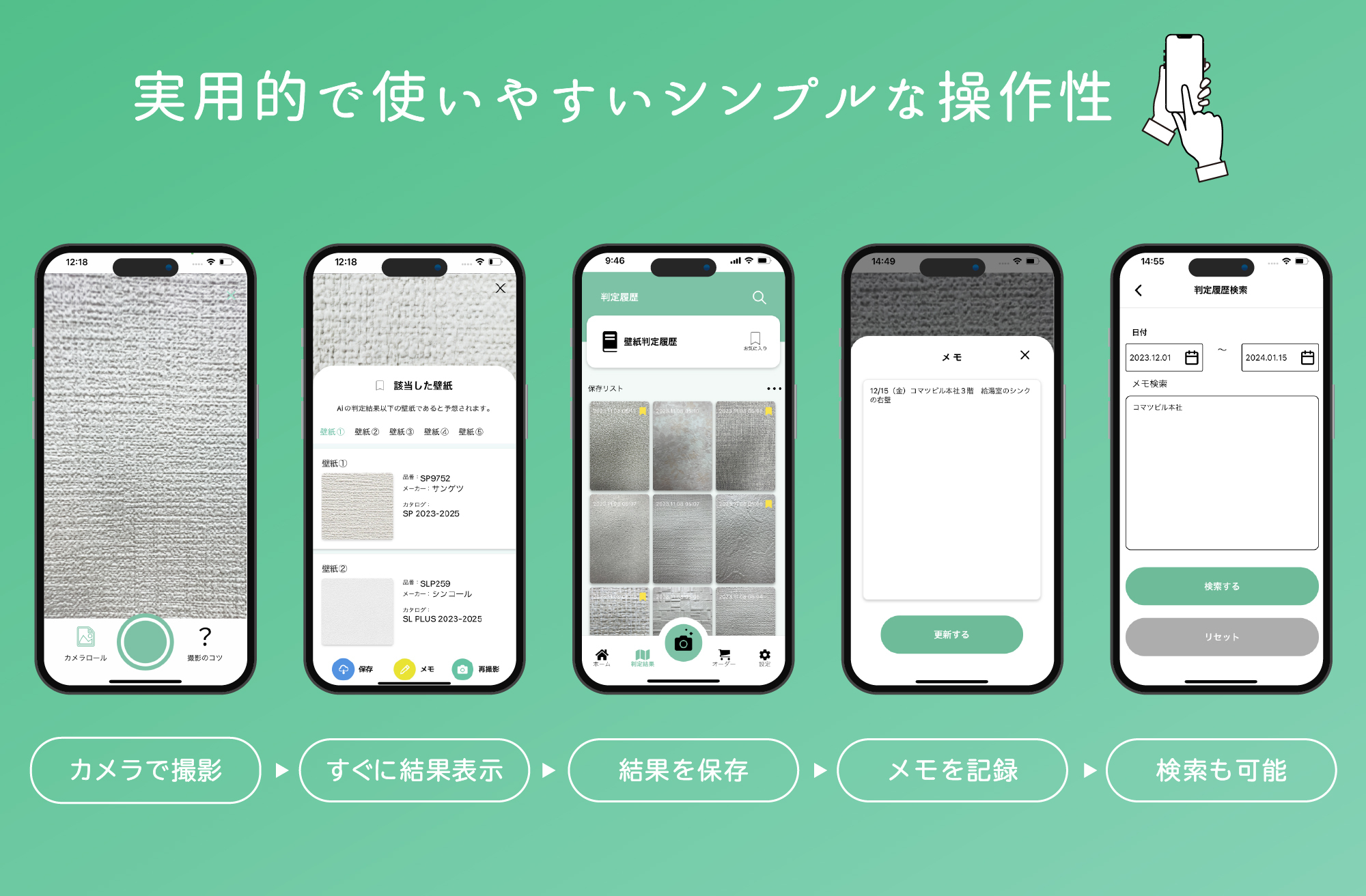 知見者でも困難な家庭用壁紙の識別課題を解決するため、同志社大学 理工学部 インテリジェント情報工学科知的機構研究室 奥田教授と共同で高精度な画像識別プログラムを開発し特許出願に至りました。色や形だけでなく、素材感を識別するこのシステムは、識別精度90%を超え、識別時間は数秒を実現しました。さらに、業者や消費者、全年代向けの操作画面を目指し、視認性の高いボタンで手軽な操作を実現するために試行錯誤を重ね、特許技術を内包したアプリ「かべぴた」をリリース。メモ機能や画像転送機能が搭載され、労力、時間、距離、移動、コストなど、さまざまな制約から解放されました。