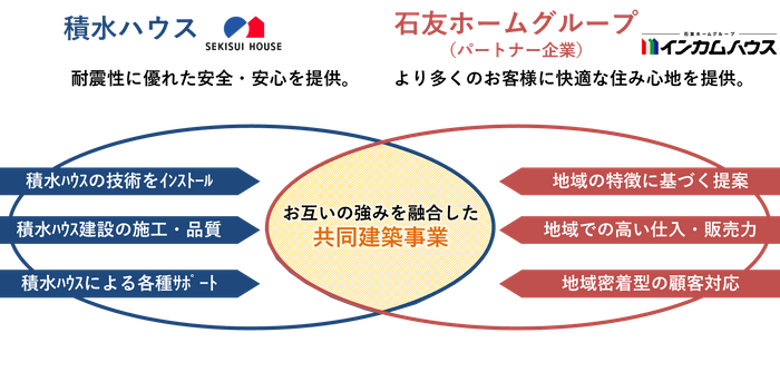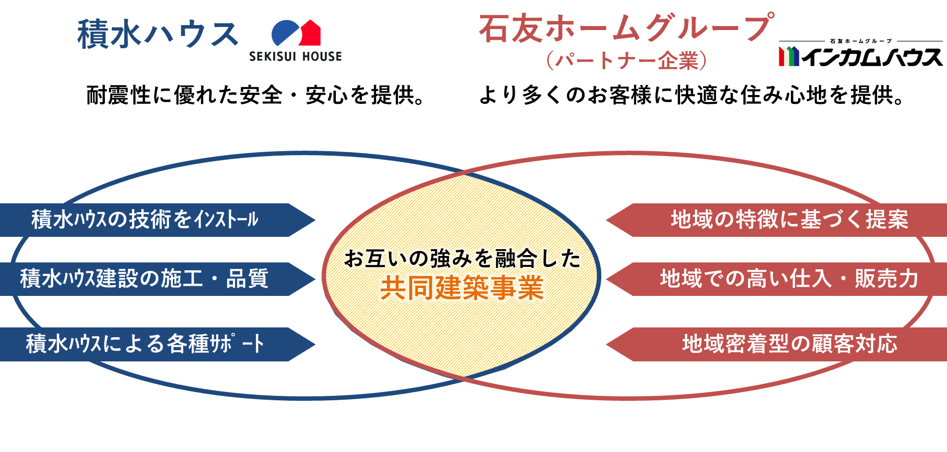 積水ハウスはSI事業を通じ、オリジナルの耐震技術「基礎ダイレクトジョイント構法」(特許出願済)や「積水ハウス建設による高精度な施工」などの技術力と高い耐震性、そして、石友ホームグループのもつ地域に密着し、お客様のニーズに応えるノウハウや強みを活かすことで、お客様に安全・安心を提供し、良質な住宅ストックの形成に貢献します。